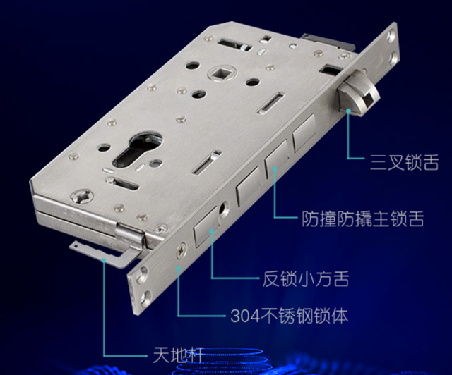鎖體離合結(jié)構(gòu),內(nèi)保險(xiǎn)設(shè)計(jì)。此外,鎖體為304不銹鋼鎖體,設(shè)有四重防護(hù),包括三叉鎖舌頭、防撞防撬主鎖舌、反鎖小方舌、天地桿。