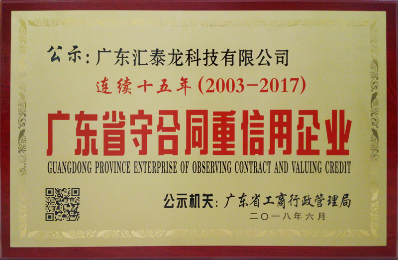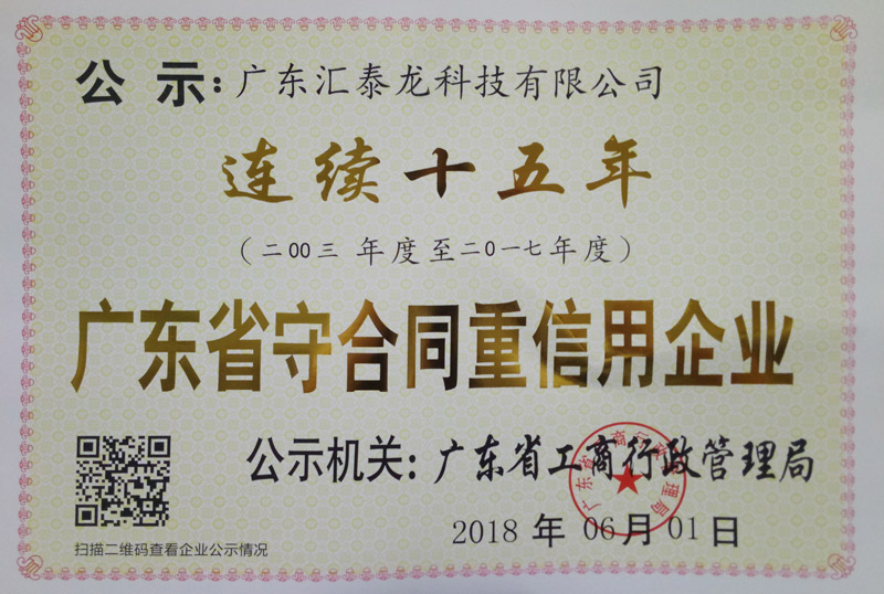 日前,經(jīng)廣東省工商行政管理局嚴(yán)格審核并予公示,廣東匯泰龍科技有限公司被授予“連續(xù)15年(2003-2017)廣東省守合同重信用企業(yè)”榮譽(yù)稱號。