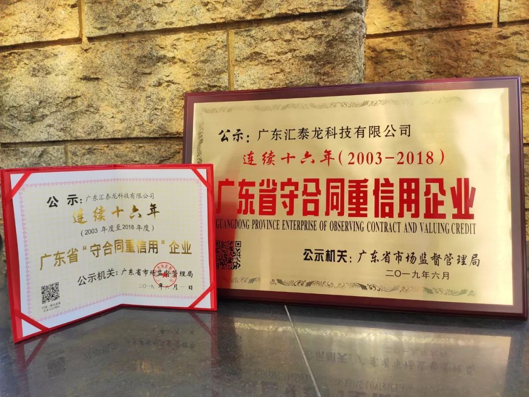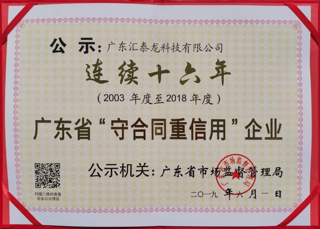 近日,經廣東省市場監(jiān)督管理局嚴格審核并予公示,廣東匯泰龍科技有限公司(現(xiàn)已更名為“廣東匯泰龍科技股份有限公司”)被授予“連續(xù)十六年(2003-2018)廣東省守合同重信用企業(yè)”榮譽稱號。