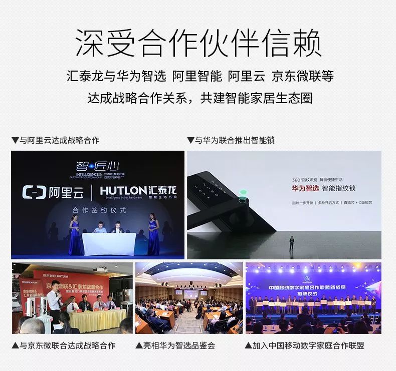 行業(yè)巨頭,精誠合作。2016年,匯泰龍在傳統(tǒng)的智能門鎖基礎上融入了云技術,率先行業(yè)推出能聯(lián)網(wǎng)、能遠程監(jiān)控的匯泰龍安全云鎖,并與各大行業(yè)巨頭達成戰(zhàn)略合作。
