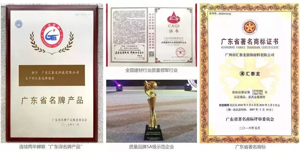 誠信經營,榮譽見證。23年來,匯泰龍因為守合同重信用,得到眾多權威機構的認可,榮獲“中國質量服務信譽AAA企業(yè)”、“全國建材行業(yè)質量領軍企業(yè)”、“全國家居業(yè)“質量品牌5A級示范企業(yè)”、“全國產品和服務質量誠信示范企業(yè)”等榮譽稱號。