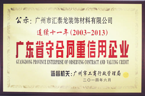 2014年6月,廣州市工商行政管理局對獲得“守合同重信用”的廣州匯泰龍裝飾材料有限公司等企業(yè)進(jìn)行表彰,此次是匯泰龍公司連續(xù)十一年獲得“守合同重信用企業(yè)”稱號。同時被廣州市越秀區(qū)企業(yè)信用促進(jìn)會評為理事單位,并頒發(fā)了牌匾及榮譽證書。這是對匯泰龍公司守法經(jīng)營、依法納稅、講究信用、誠信經(jīng)營、品牌影響的充分肯定。