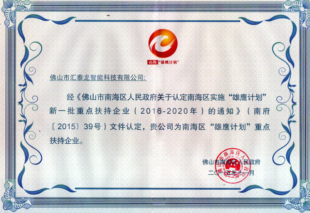 佛山市匯泰龍智能科技有限公司被認(rèn)定為南海區(qū)“雄鷹計(jì)劃”重點(diǎn)扶持企業(yè)