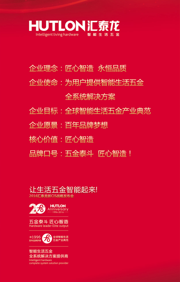 在匯泰龍品牌走過二十周歲之際,智能家居時(shí)代賦予匯泰龍新的使命和定義:打造國際高端智能生活五金第一品牌!延續(xù)求實(shí)、向上、敬業(yè)、和諧的文化根基,傳承匯泰龍20年輝煌底蘊(yùn)及品牌影響力 。