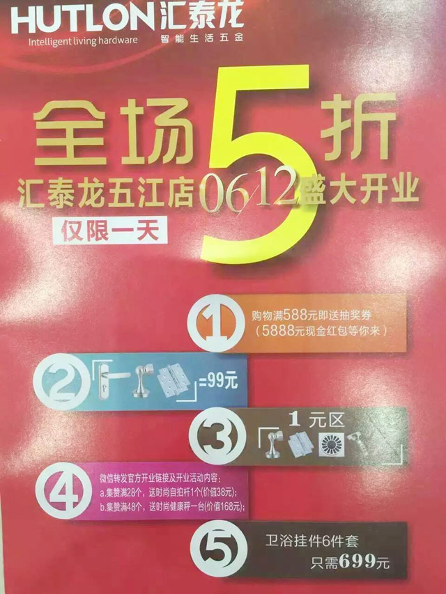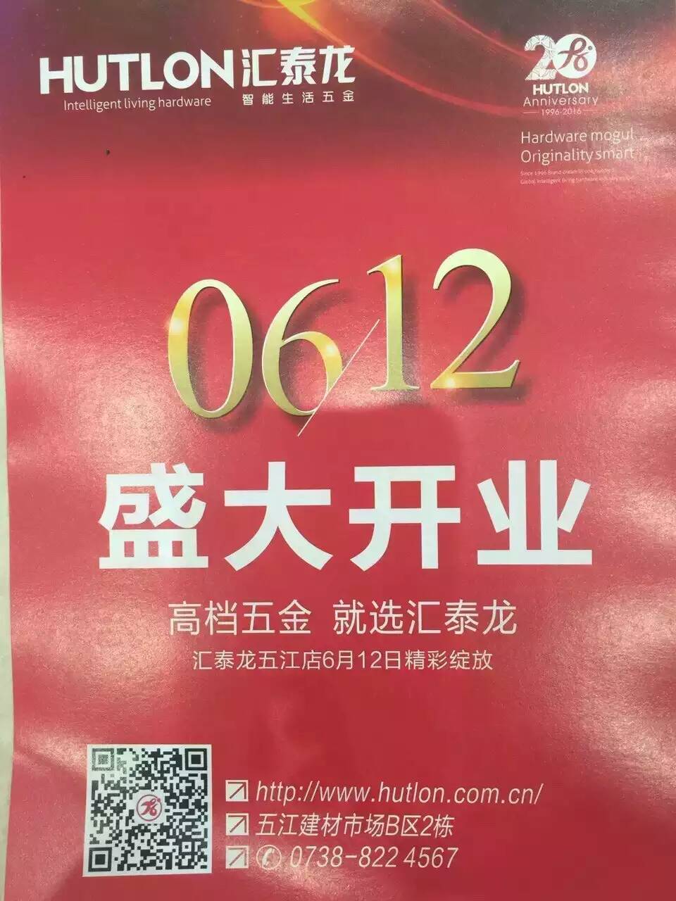 今天,端午節(jié)的假期也結(jié)束了,人們紛紛回歸工作崗位,開(kāi)始新的努力。我們都懷揣著自己的夢(mèng)想,一步一步前行,希望有天會(huì)到達(dá),夢(mèng)想的彼岸。6月12日,這是個(gè)值得慶賀的日子,匯泰龍智能生活五金湖南婁底專(zhuān)賣(mài)店在今天盛大開(kāi)業(yè)了!除了全場(chǎng)五折優(yōu)惠,還有各種開(kāi)業(yè)活動(dòng),歡迎前來(lái)選購(gòu)體驗(yàn)!