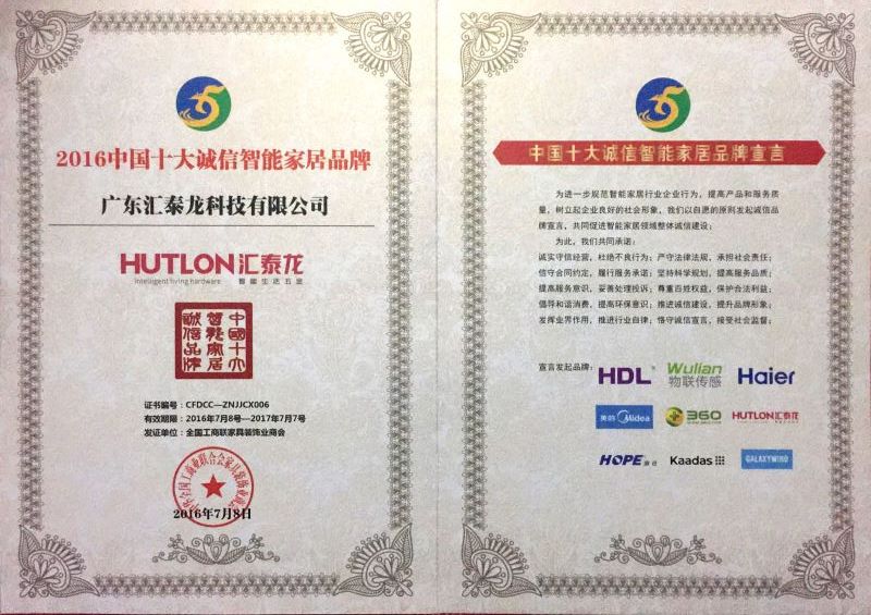 在此期間,匯泰龍參加了第四屆中國互聯(lián)網(wǎng)與智能家居誠信建設(shè)大會,與此同時,匯泰龍更被全國工商聯(lián)家具裝飾業(yè)商會授予“2016中國十大誠信智能家居品牌”稱號。
