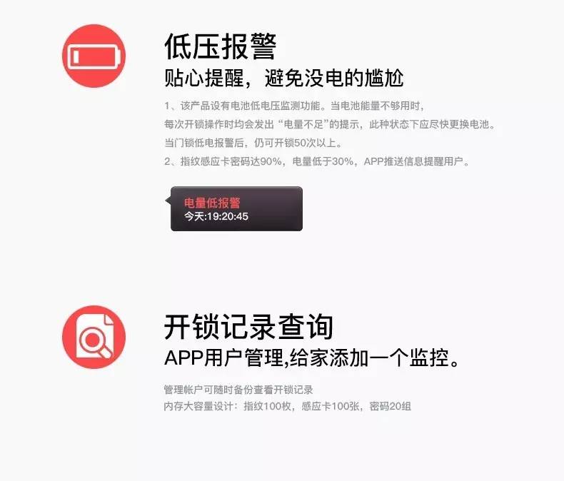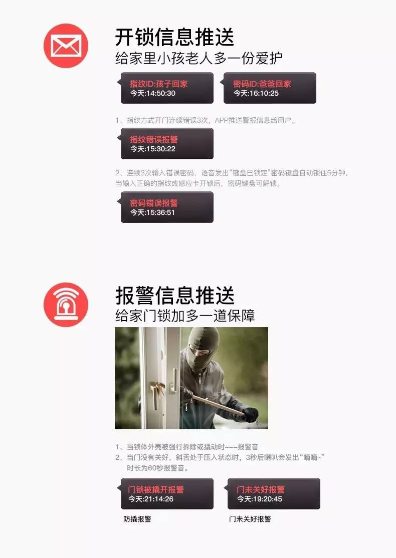 在安全方面,這款云智能門(mén)鎖采用一體化結(jié)構(gòu)、上提把手反鎖設(shè)計(jì),擁有異常報(bào)警信息推送、歷史記錄查詢(xún)、保持門(mén)鎖在線(xiàn)、在線(xiàn)故障處理等功能。