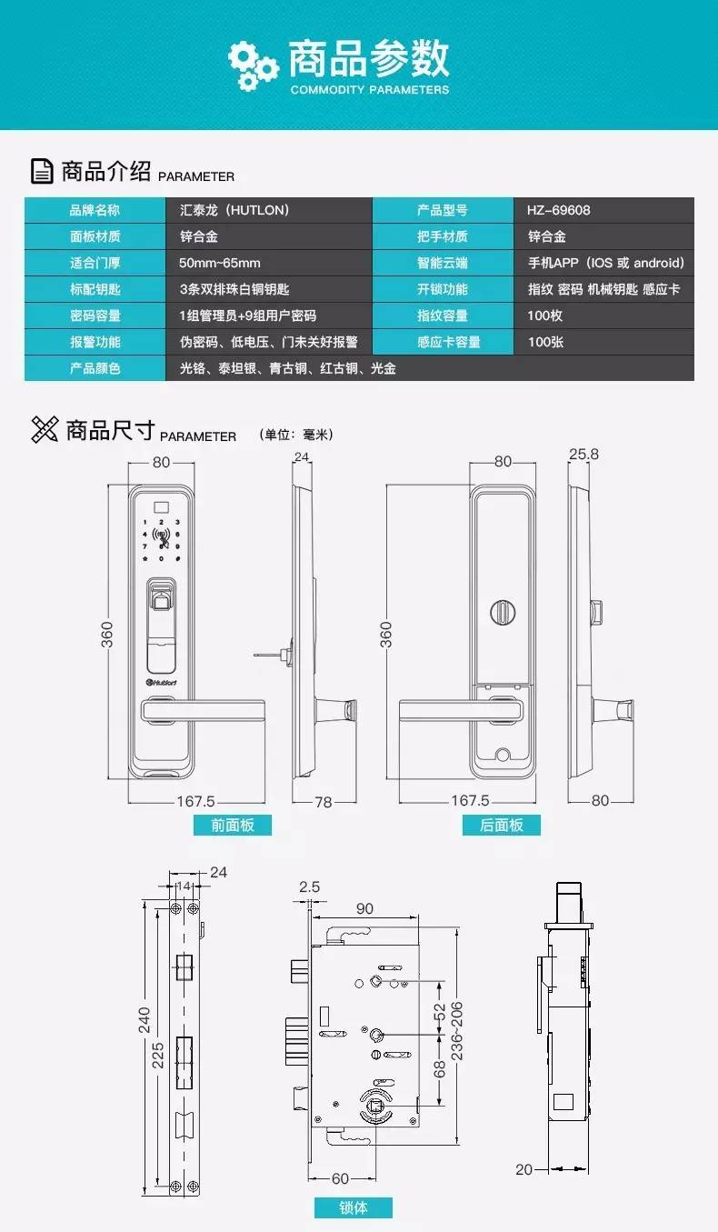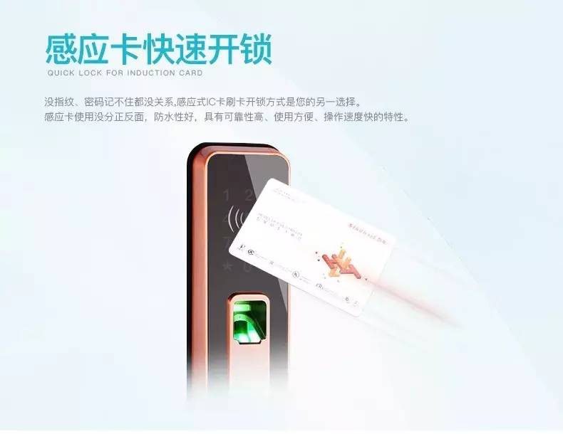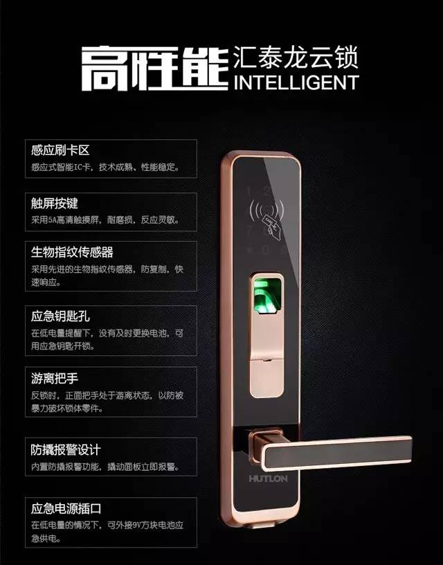 匯泰龍?jiān)奇i采用先進(jìn)的生物識(shí)別技術(shù),擁有指紋、密碼、感應(yīng)卡、機(jī)械鑰匙、手機(jī)APP五合一開(kāi)鎖方式,指紋輕觸間實(shí)現(xiàn)開(kāi)鎖,配有真人語(yǔ)音提示,且擁有低電量雙重提醒功能。擁有十幾項(xiàng)發(fā)明專(zhuān)利,幾十項(xiàng)實(shí)用新型專(zhuān)利,集便捷、安全于一身。