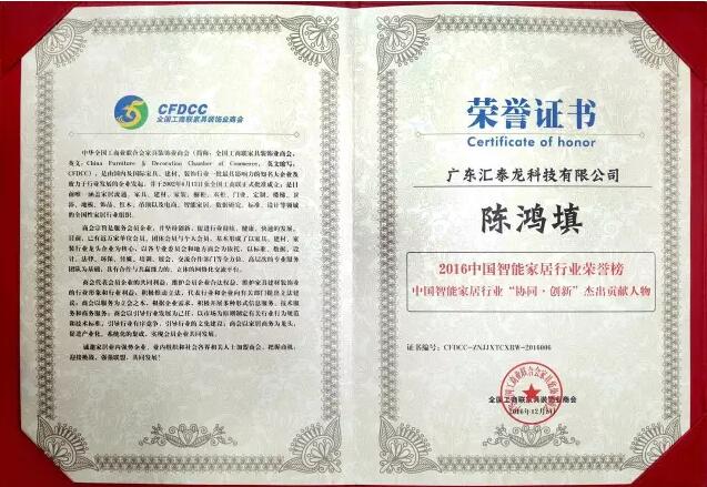 匯泰龍公司與匯泰龍董事長陳鴻填先生榮登“2016中國智能家居行業(yè)榮譽榜”