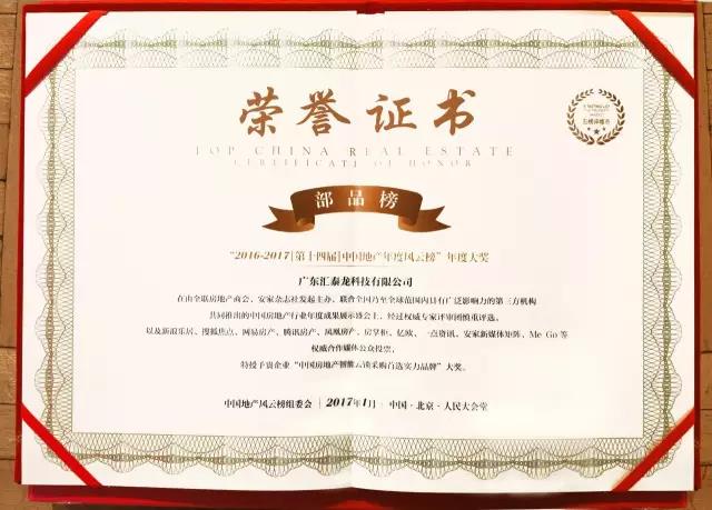 匯泰龍榮獲“‘2016-2017[第十四屆]中國地產(chǎn)年度風云榜’年度大獎”