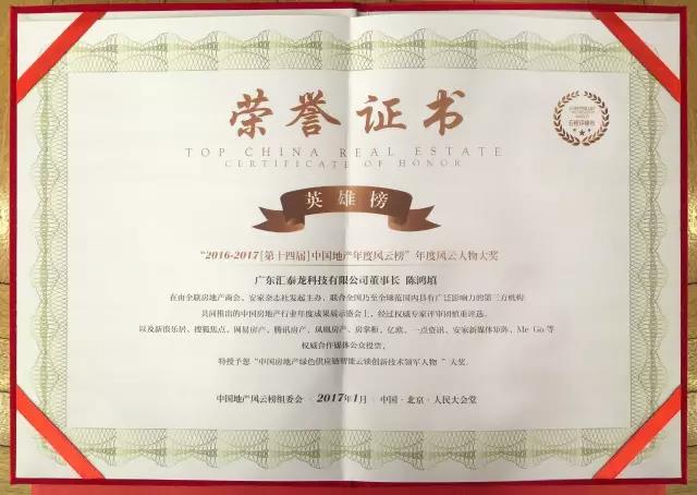 匯泰龍董事長陳鴻填先生榮獲“‘2016-2017[第十四屆]中國地產(chǎn)年度風云榜’年度風云人物大獎”