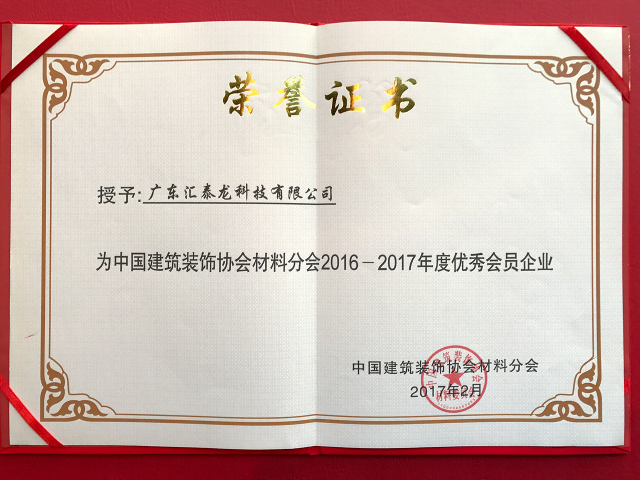 匯泰龍榮膺「中國(guó)建筑裝飾協(xié)會(huì)材料分會(huì)優(yōu)秀會(huì)員」